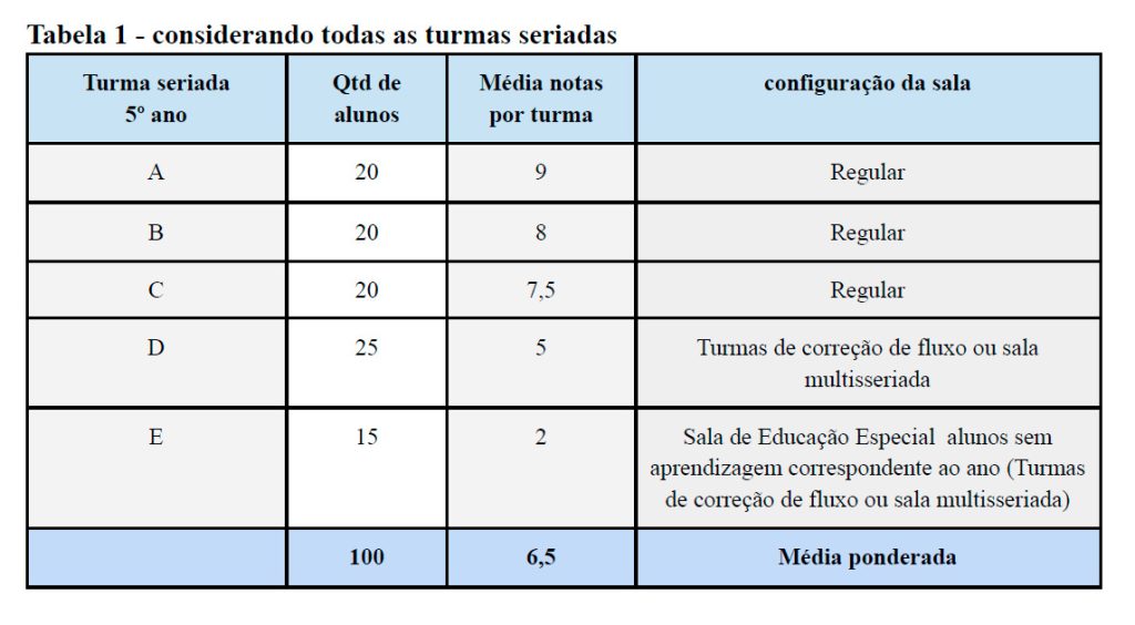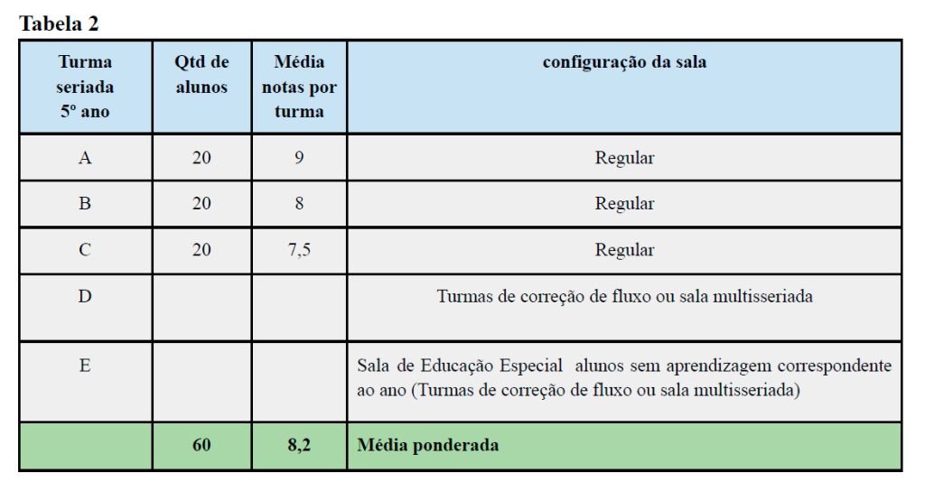 Na Tabela 1, todas as turmas são consideradas no cálculo: as regulares, as multisseriadas ou de correção de fluxo e também a sala de Educação Especial, ainda que sem aprendizagem formal. O resultado médio ponderado é 6,5, refletindo a diversidade real da escola pública e as diferenças de percurso, contexto e condição de aprendizagem entre os estudantes. Essa leitura possibilita uma análise concreta dos desafios a enfrentar, bem como dos investimentos necessários para melhorar a aprendizagem e reduzir as desigualdades.