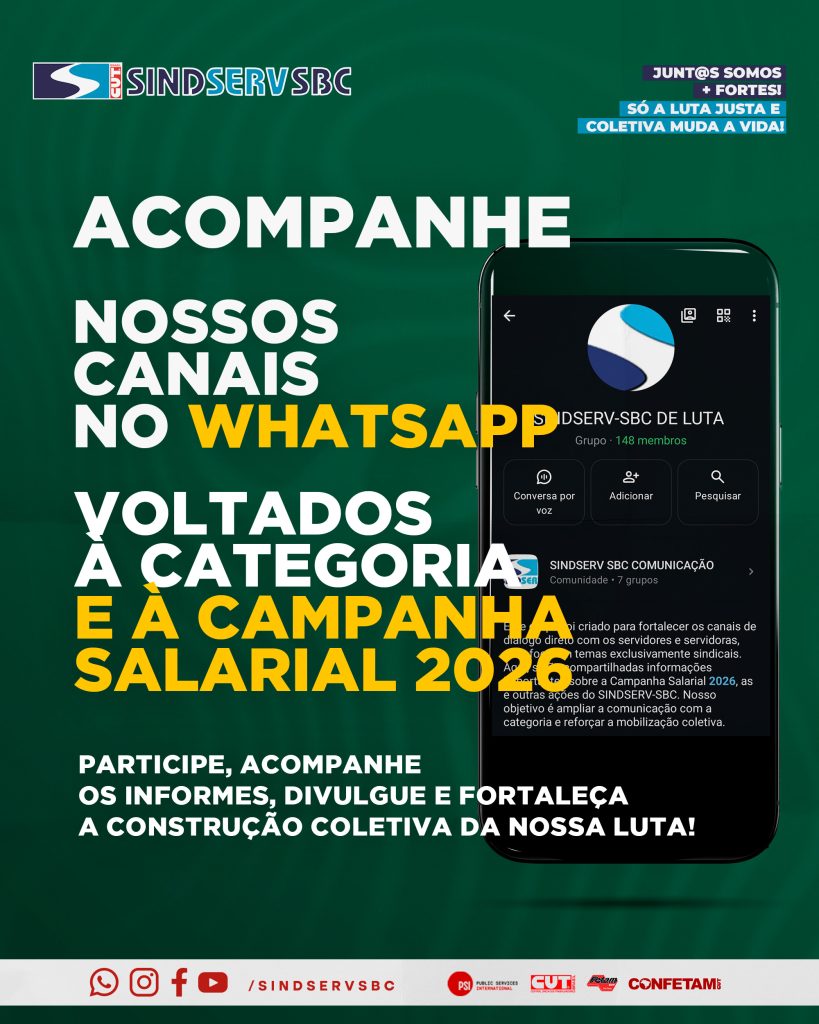 – Grupo “SINDSERV-SBC DE LUTA”? Espaço livre e democrático para participação da categoria, envio de dúvidas, sugestões e contribuições para a luta, considerando a pauta aprovada em assembleia da Campanha Salarial 2026.