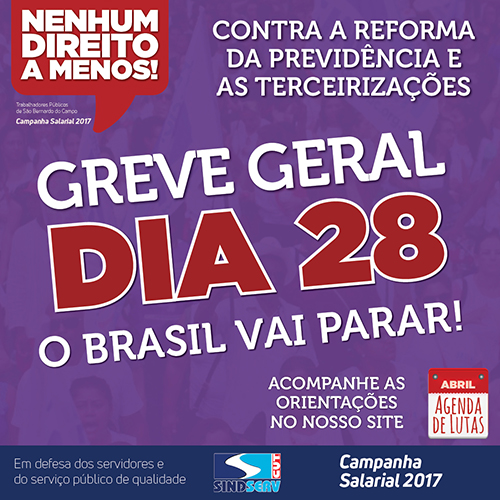As centrais sindicais conclamam seus sindicatos filiados para, no dia 28, convocar os trabalhadores a paralisarem suas atividades, como alerta ao governo de que a sociedade e a classe trabalhadora não aceitarão as propostas de reformas da Previdência, Trabalhista e o projeto de Terceirização aprovado pela Câmara, que o governo Temer quer impor ao País.