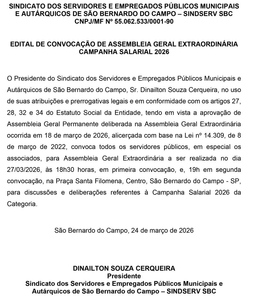 O Presidente do Sindicato dos Servidores e Empregados Públicos Municipais e Autárquicos de São Bernardo do Campo, Sr. Dinailton Souza Cerqueira, no uso de suas atribuições e prerrogativas legais e em conformidade com os artigos 27, 28, 32 e 34 do Estatuto Social da Entidade, tendo em vista a aprovação de Assembleia Geral Permanente deliberada na Assembleia Geral Extraordinária ocorrida em 18 de março de 2026, alicerçada com base na Lei nº 14.309, de 8 de março de 2022, convoca todos os servidores públicos, em especial os associados, para Assembleia Geral Extraordinária a ser realizada no dia 27/03/2026, às 18h30 horas, em primeira convocação, e, 19h em segunda convocação, na Praça Santa Filomena, Centro, São Bernardo do Campo – SP, para discussões e deliberações referentes à Campanha Salarial 2026 da Categoria.
