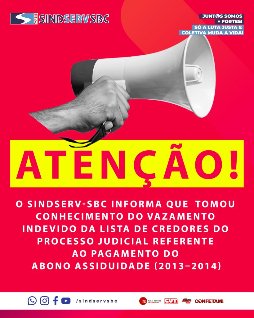 O SINDSERV-SBC informa que tomou conhecimento do vazamento indevido da lista de credores do processo judicial, ocorrido em grupos de WhatsApp, referente ao pagamento do Abono Assiduidade relativo ao período de novembro de 2013 a novembro de 2014, que não foi pago às servidoras e aos servidores da Educação.